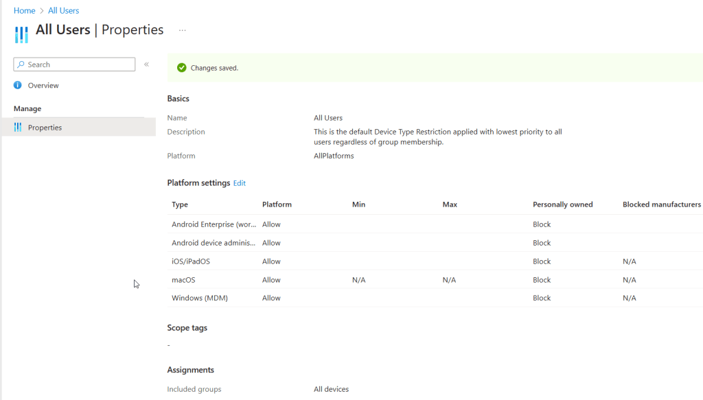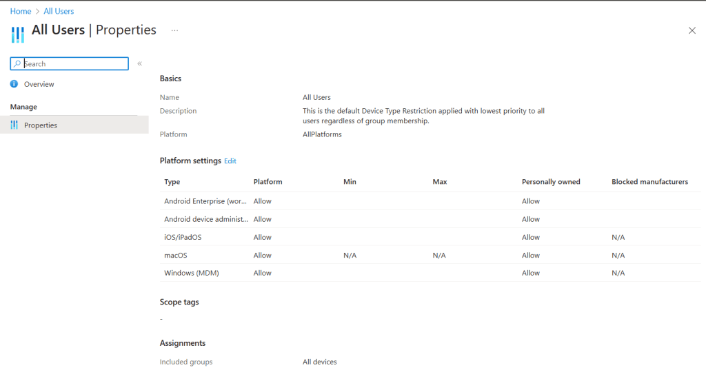 After clicking on All users we > Properties > we can see the platform settings and under Personally owned we can see if they are able to enroll themselves. To restrict all platforms from being able to enroll themselves we are going to click on Edit next to platform settings.