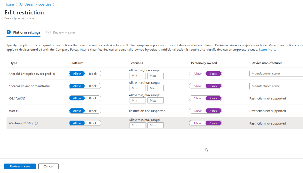 In the platform settings move the radio button under Personally owned to Block. Once we enable those settings, users will not be able to enroll Personally owned devices into Intune. Once complete, Review and save.