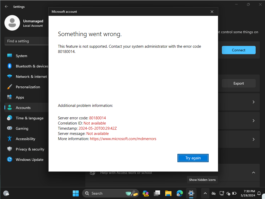 Great, now let’s put this test to work and see what happens when users try to enroll personal devices into our Intune tenant. After trying to enroll the device to Intune, we get the following error message: the Intune enrollment error 80180014 occurs when Windows MDM enrollment is disabled in the device enrollment restriction policy we set in this blog.