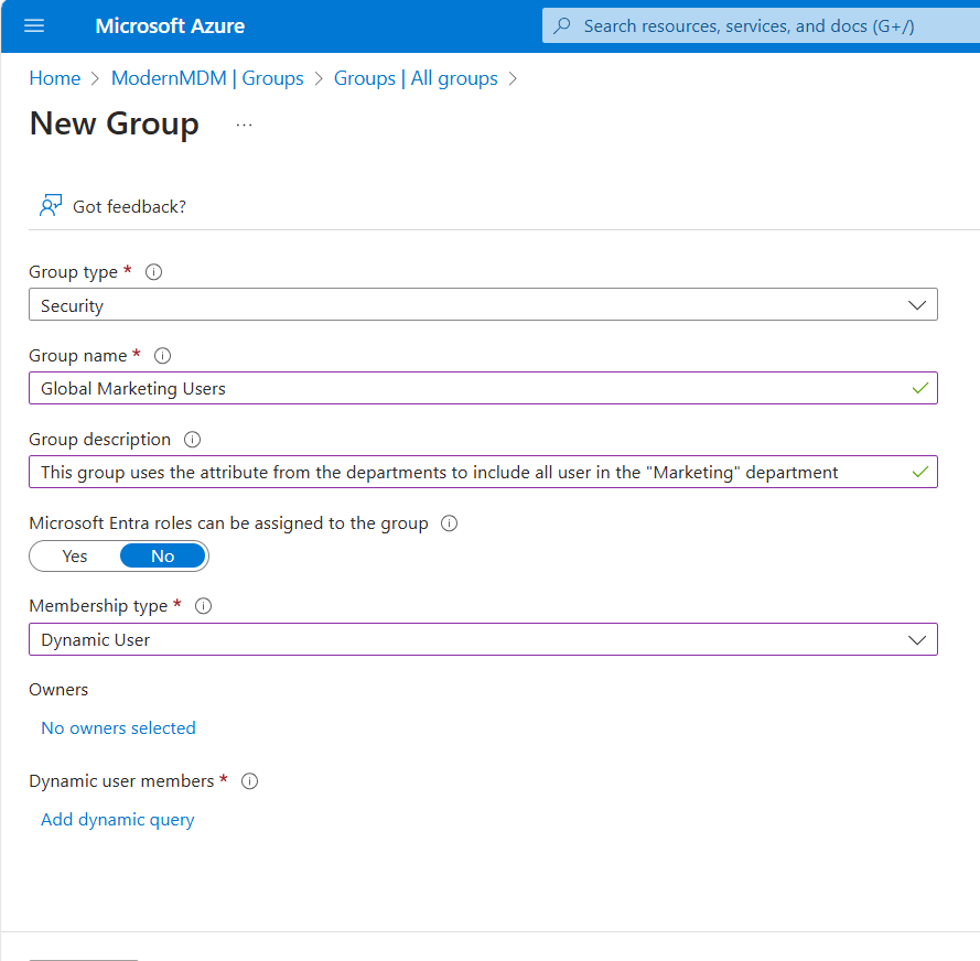 Scenario: You are tasked with creating a dynamic group so that all users in the Marketing department are automatically added to a dynamic user group.