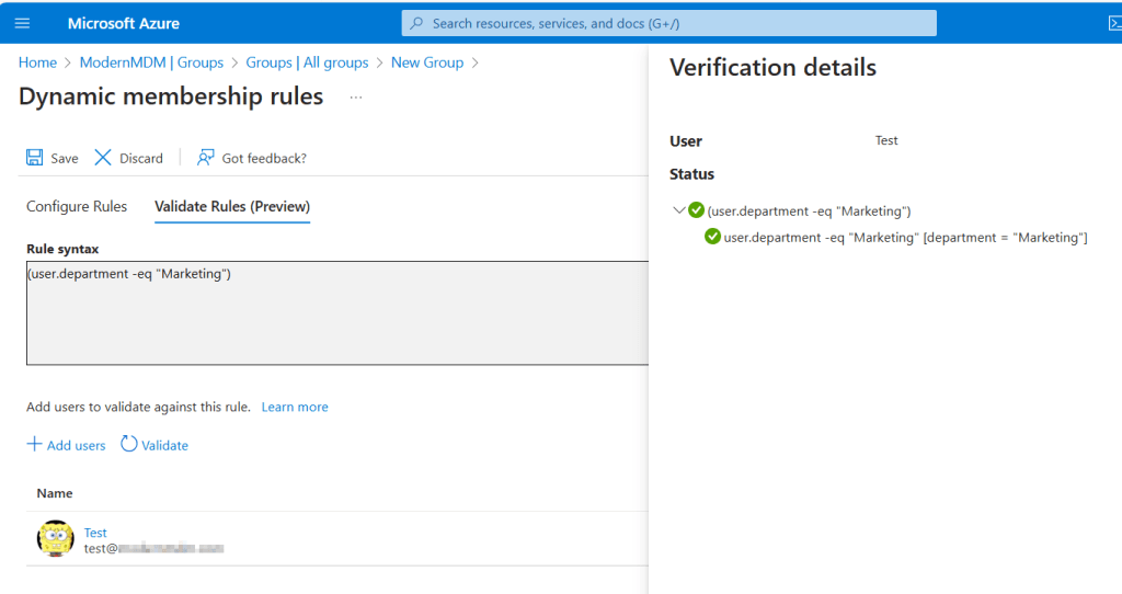 Quick Pause: Let’s test if our user who is in the Marketing department is getting recognized by the rule we set. You can do so by selecting Validate Rules (Preview) where you select a user to test the rule syntax.