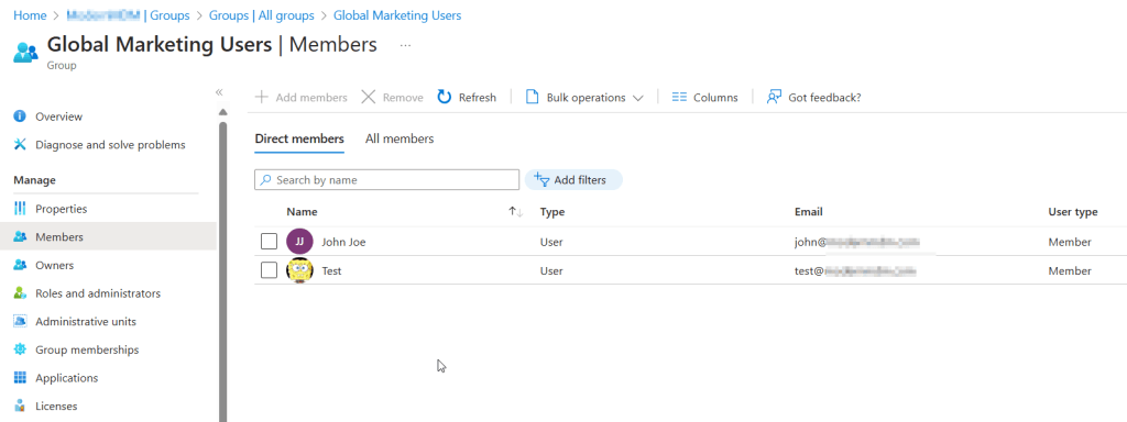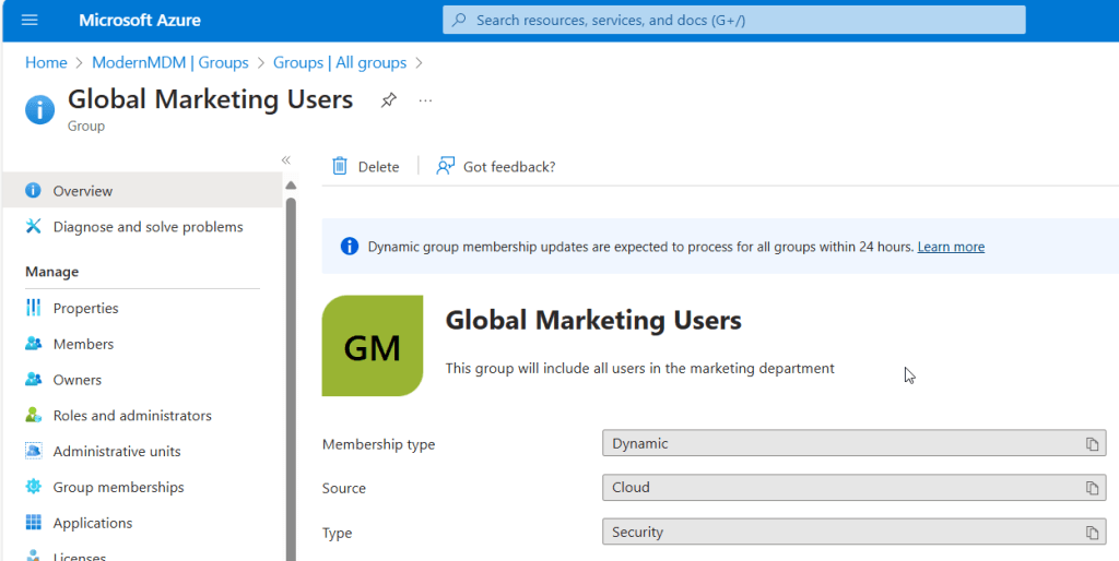 Review and create your group. Navigate to Groups in Microsoft Entra ID and search for Global Marketing Users to verify that all users in the Marketing department are being added by clicking on Members. In the overview section, you will notice that the user group type is Dynamic. In the second picture, you can see all the users in the Marketing department, which are automatically added, eliminating the need to manually add or remove users.